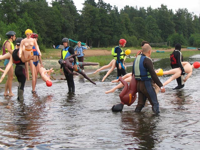 参加者はウェットスーツ、救命胴衣、ヘルメットの完全武装をしてから、彼らの愛すべき「女性」とともに川を泳ぎます。観客はその姿を生暖かい微笑みで見守ります。この一見楽しそうなレース、観客とは裏腹に参加者はけっこう深刻です。