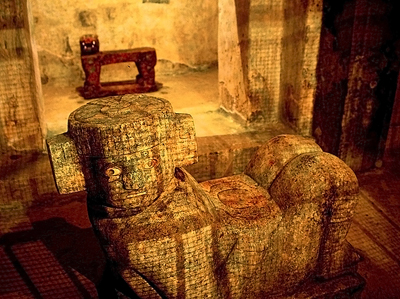 チャック・モールはお腹に鉢を持っているのだが、ここには生きたまま胸を裂かれた生け贄の心臓が、天体の運行に疲れた太陽に捧げられていたという。