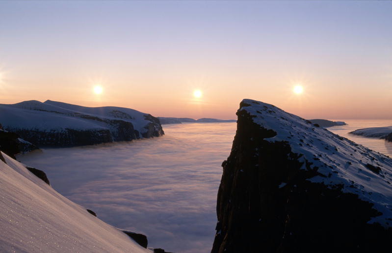 長時間露光によって撮影された、北極諸島にあるバフィン島の空に浮かんだ太陽。