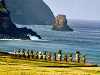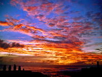 タハイの夕陽 イースター島の中心は約3,000人の島民が住む村バンガロアで、ほとんどの住居、ホテル、商店がここに集中する。市の中心から10分ほどの街外れにタハイの遺跡があり、アフと呼ばれる石を積み上げた祭壇に7体のモアイが立っている。人々は毎夕このタハイに集まって、寝転んで水平線を見つめる。