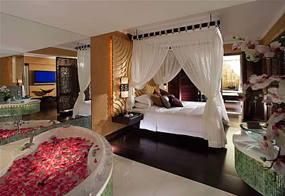 ゲストルームはプールエリアを望む、ラニア・ヴィラ・スイート。オープンエアでゆったりとした造り。バスルームだけでも約46平米もあり、もちろんジャグジーがついています。…♪