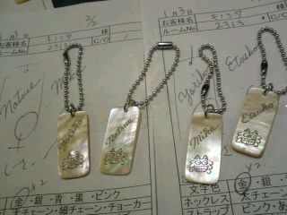 この磨いた貝をハート型や長方形に切りプレート状にしたものに、文字などを。