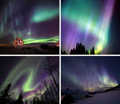 オーロラは、沢山の異なる形や色を発します。さんさんと輝き踊る光は、